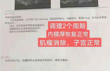 我就是张医生治好的,刚开始查出功血的时候就是经量多、经期时间长、有血块,一来就是十几天,吃药、打针不管用,没办法最后听医生的话刮了宫,术后一直反复发作,来来回回刮了三次宫,导致内膜薄,每天都愁的不行。去年找到张医生调理了两个月 ,从19年2月6日开始调理,这段期间我感觉越来越好,最明显的是血止住了,不再一流流成河了,19年3月4发现月经周期正常了,月经能按时来按时走,量也正常不流血块,不痛经了,最后6天经期过了一点血不出,这都是以前最奢望的事情,竟然真的实现了。看到自己病情越来越好我又让张医生给我调理了一个月。 4月底去做了检查,子宫内膜厚度达到了正常水平!