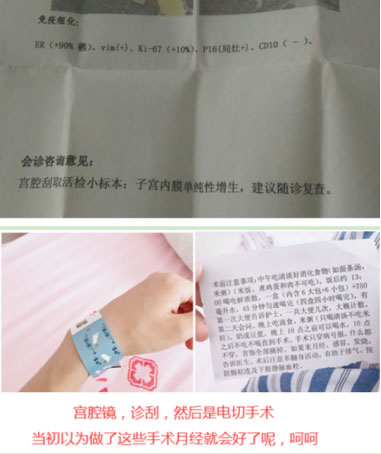 后来换到省里的大医院,还是翻来覆去只会开那几种药,一点改善都没有!最后大夫说"你内膜厚还充血,实在不行你刮宫吧,就刮掉上层的膜。"我光想快点好,就做刮宫了。刮比较疼,但持续只有大约60秒吧,还有吸比较疼,因为要把宫腔内的膜和血吸出去,特别疼。有一个位置不太好,第三天又做了电切手术。